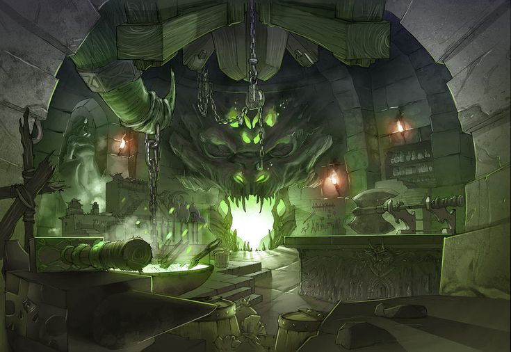 📕This large workshop was badly damaged by the ancient spell battle that laid waste to the mine.Worktables taking up two corners of the room are scorched, and the plaster has been burned off the masonry walls. In the middle of the room, a stone pedestal holds a small brazier in which an eerie green flame dances and crackles. The brazier and its pedestal appear to have been untouched by the forces that destroyed this area.